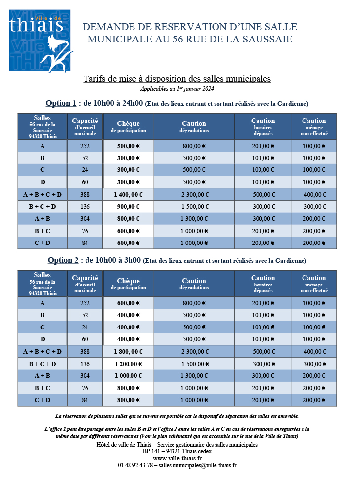 Hôtel de Ville de Thiais – Service gestionnaire des salles municipales – BP 141 – 94321 Thiais Cedex
