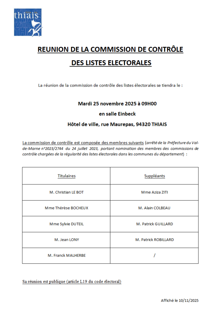 - Mardi 25 novembre 2025 à 9h en salle Einbeck, Hôtel de ville, rue Maurepas, 94320 THIAIS